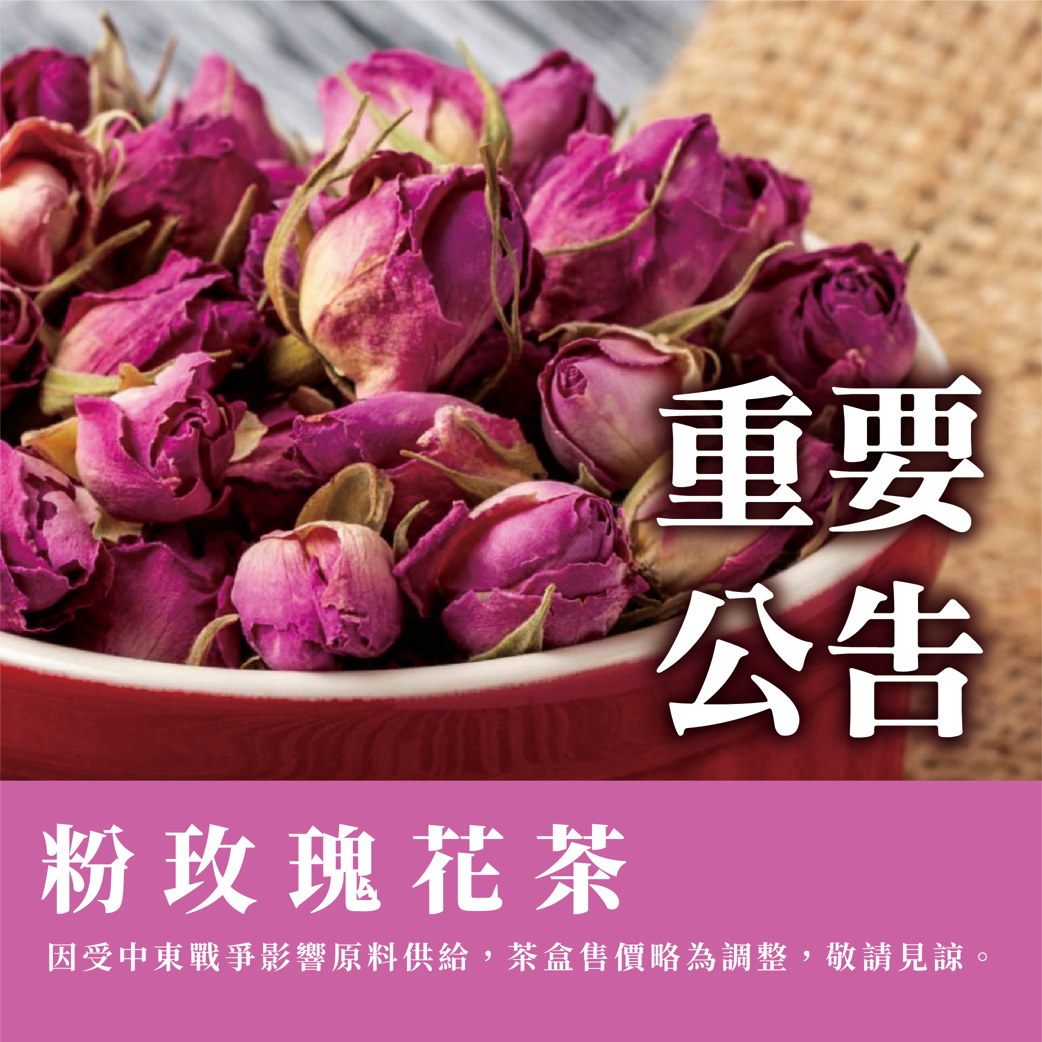因玫瑰花主要產地中東近期受戰爭影響,原料供應全面中斷,導致進貨成本大幅上升 為維持產品品質與穩定供應,「粉玫瑰花茶包」進行價格調整,敬請見諒